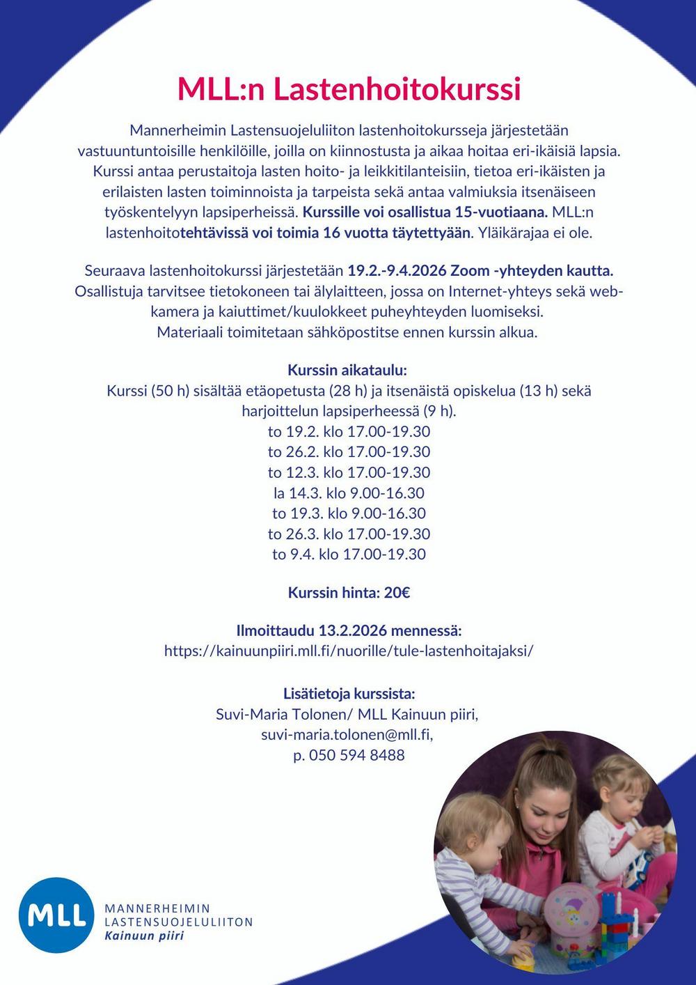 Seuraava lastenhoitokurssi järjestetään 19.2.-9.4.2026 Zoom -yhteyden kautta.